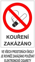 Tabulka - Kouření zakázáno ve všech prostorách školy je rovněž zakázáno používat elektronické cigarety Druh materiálu: plast., velikost: 270x150 mmSkladem 540 Kč33 Kč bez DPH